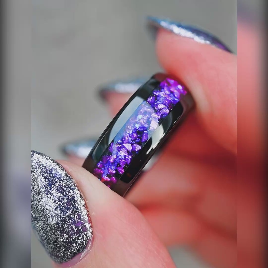 Crab Nebula Ring, Alexandrite Wedding Band, Black Tungsten, 8mm-6mm-4mm Outer Space Ring, Black, Dome, Polish, Unique Purple Ring, Engraving
