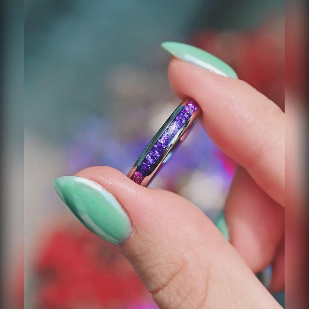 This Amethyst Wedding Band is crafted from durable silver tungsten with a stunning purple amethyst inlay. Its polished dome and comfort fit design make it a stylish choice for women or men. Perfect as a wedding band, promise ring, or anniversary gift, this unique ring stands out with timeless appeal.
