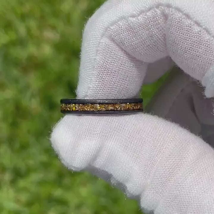 ►This 4mm tungsten band stands out with its striking blend of crushed citrine glass stones set against a sleek black finish. The ring's sandblasted texture and flat profile create a unique and modern look, while the vibrant citrine accents add a touch of warmth and brilliance. Designed with a comfort fit interior, it ensures easy and comfortable wear for both women and men. Whether chosen as a meaningful wedding band, a heartfelt promise ring, or a thoughtful anniversary gift, this ring symbolizes lasting commitment. Add a personal touch with custom engraving to make it truly one-of-a-kind.