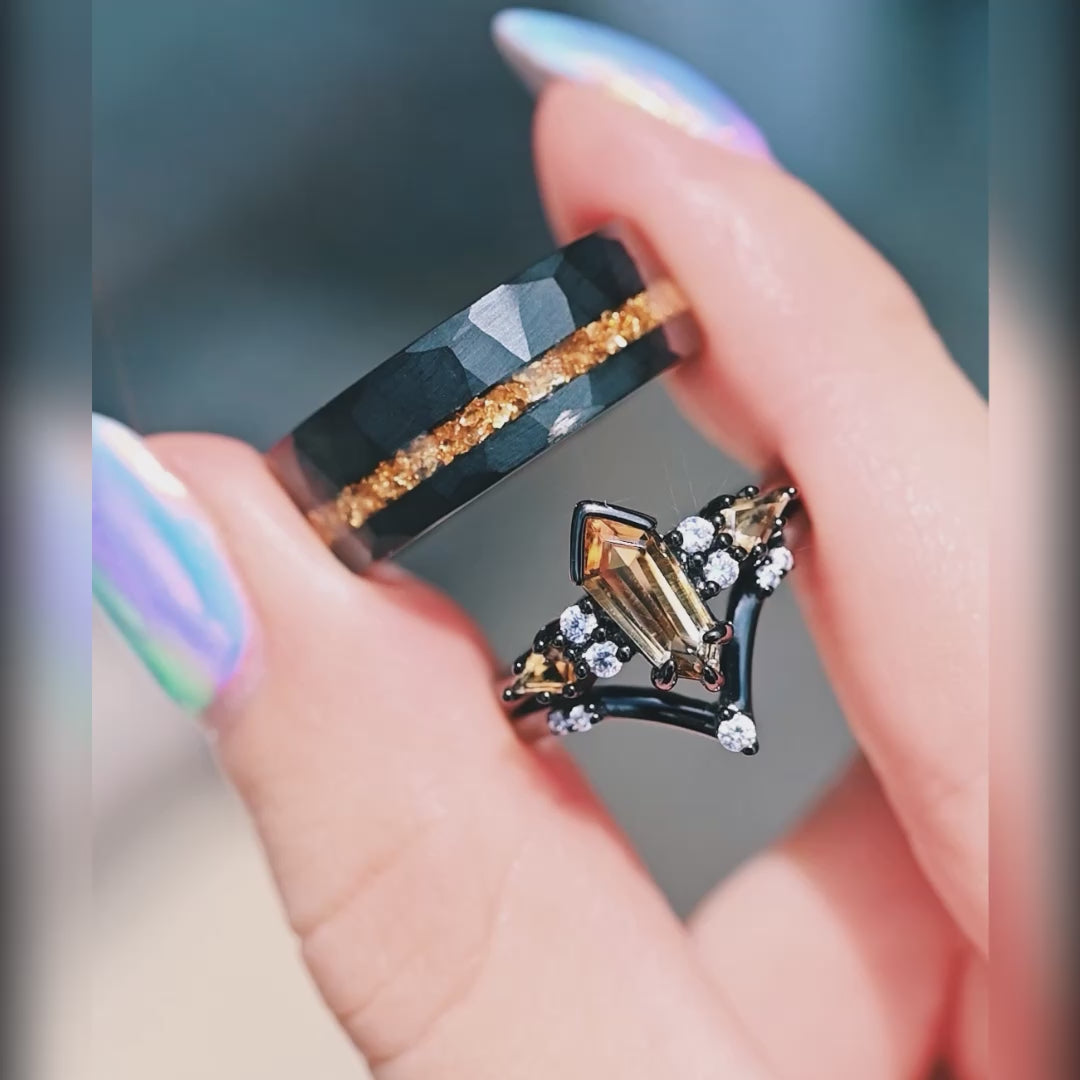 ►This 8mm men’s tungsten band is the perfect blend of strength and style. Featuring crushed citrine glass stones set against a hammered black tungsten finish, this ring offers a unique, textured look that stands out in any collection. The flat design, combined with a comfort fit, ensures durability and ease of wear for everyday use. Whether it's chosen as a wedding ring, promise ring, or a special anniversary gift, the striking citrine accents add a touch of warmth and individuality. Personalize it further with custom engraving to create a meaningful piece that tells your story in a distinct and lasting way.