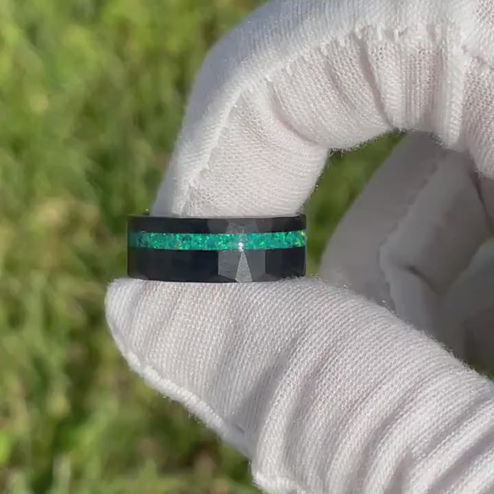 ►This 8mm men’s tungsten band combines rugged elegance with a unique touch, making it more than just a ring. The band features a captivating inlay of crushed green opal, creating a striking contrast against the matte brushed black tungsten surface. Its hammered, flat design adds a distinctive texture, giving the ring a bold yet refined appearance. Crafted for a comfort fit, it’s perfect for everyday wear and special occasions alike. Whether chosen as a wedding ring, a heartfelt promise, or a memorable anniversary gift, this ring is made for moments that matter. Add a personal touch with custom engraving to make it a truly one-of-a-kind gift for him.