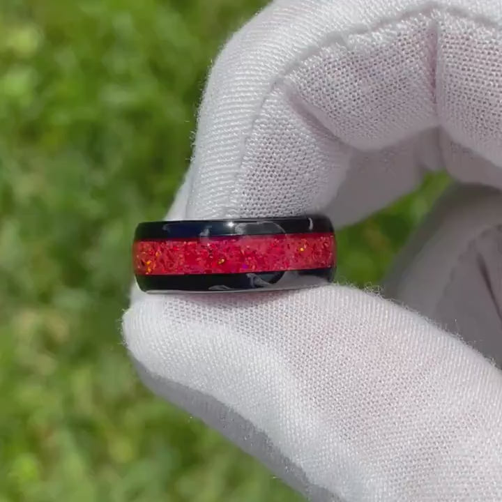 8mm Red Fire Opal Ring, Black Tungsten Ring, Men Wedding Band, Crushed Red Opal, Polished, Dome, Comfort Fit, Unique Ring
