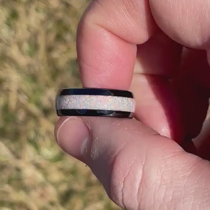 8mm White Fire Opal Ring, Black Tungsten Ring, Men Wedding Band, Crushed White Opal, Polished, Dome, Comfort Fit, Unique Ring, Gift for Him