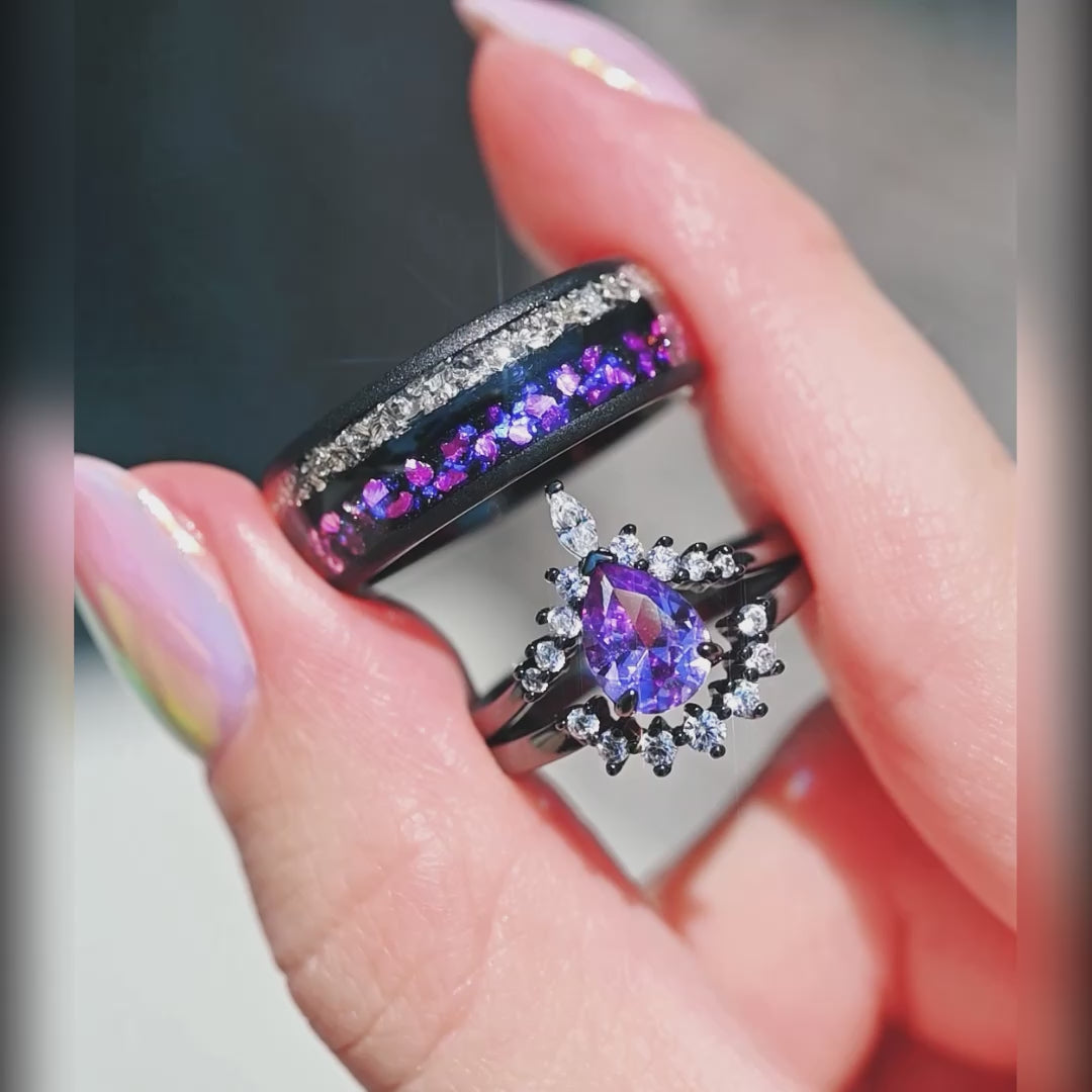 Alexandrite Ring Men, Purple Wedding Band, Crab Nebula Ring, Black Tungsten Band, 8mm Space Ring, Dome, Sandblast, Mens Engagement Ring