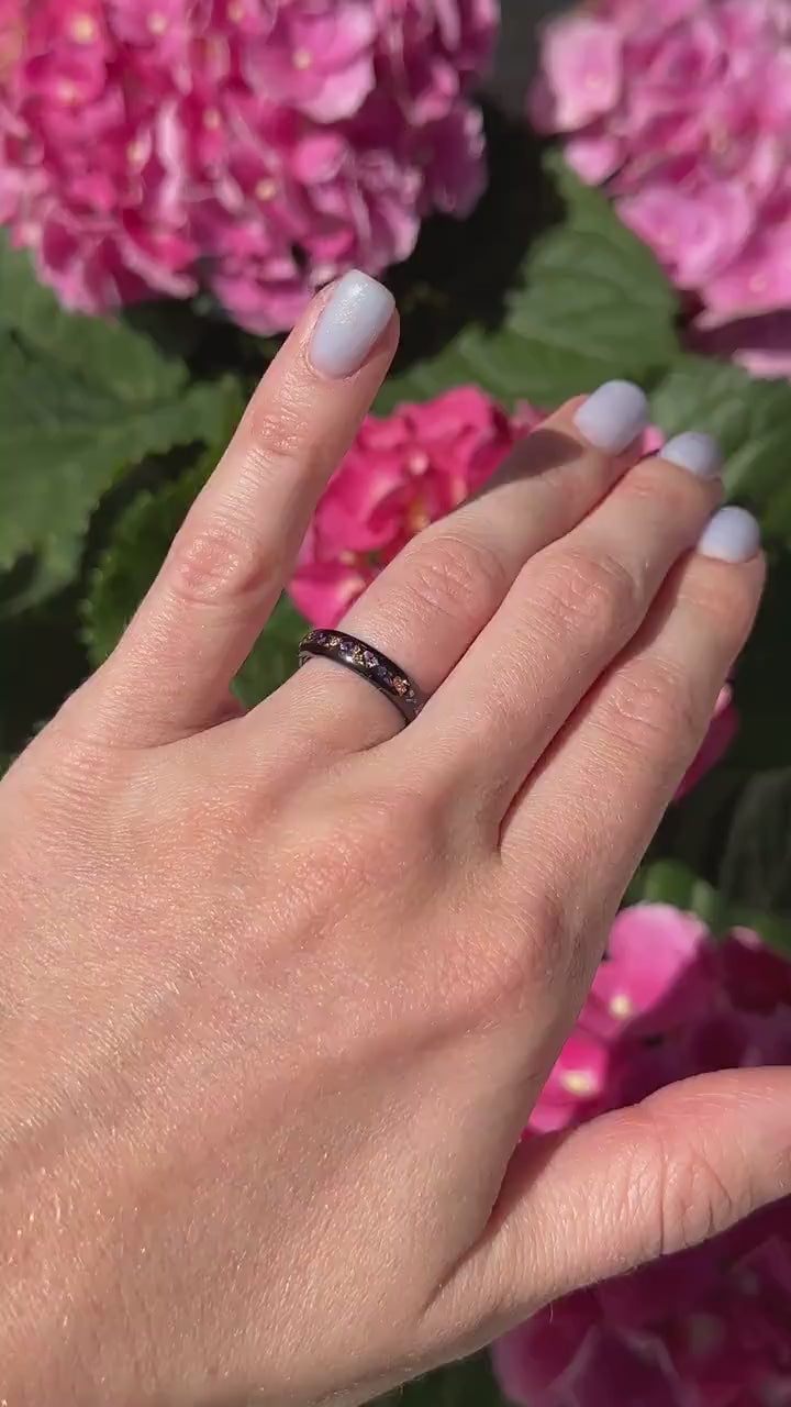 This Purple Amethyst Wedding Band is crafted in black tungsten with crushed amethyst and rose gold foil accents. Featuring a stunning purple design, this durable ring is made for daily wear. A unique choice for women or men, perfect as a wedding band, promise ring, or special gift.