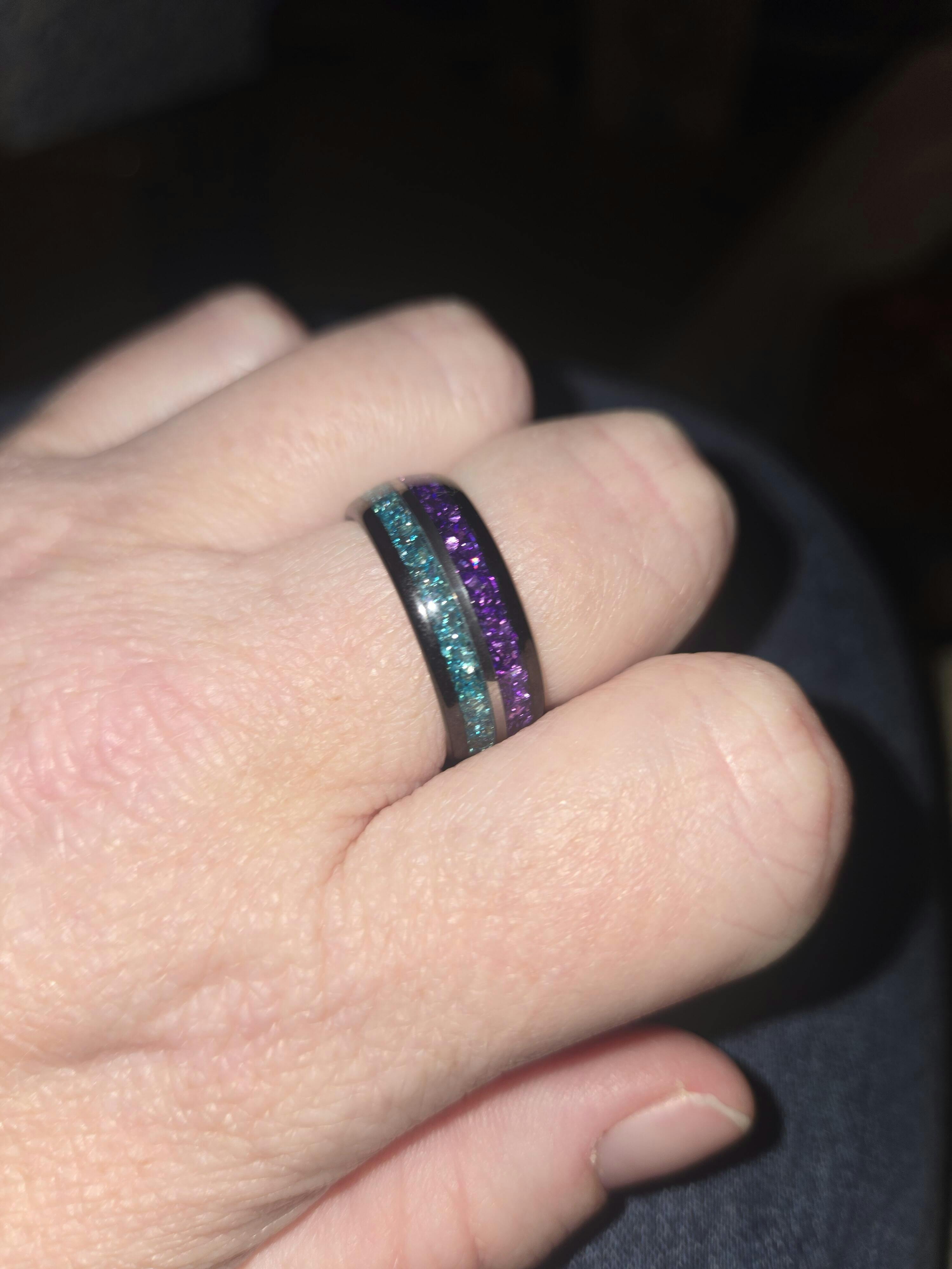 This bold black tungsten men’s ring features amethyst and aquamarine in a stunning two-tone design. Inspired by the Northern Lights, it’s a unique celestial wedding band or promise ring - perfect for nature lovers, stargazers, or anyone drawn to one-of-a-kind jewelry.