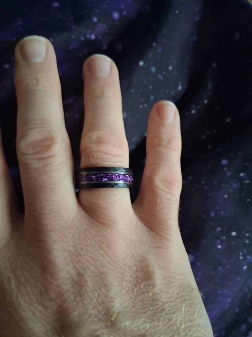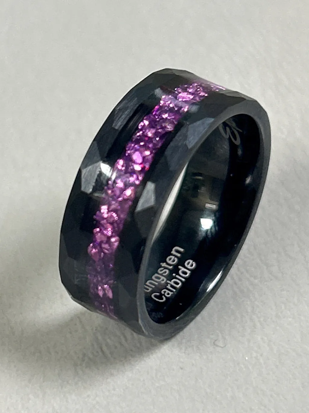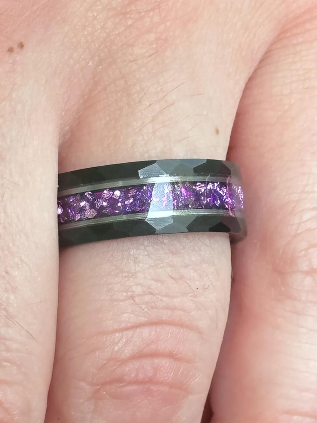 This tungsten wedding band features a striking crushed amethyst inlay, showcasing a rich purple color that stands out from traditional wedding bands. Durable and comfortable with a hammered texture, it’s a bold choice as a mens wedding band, promise ring, or anniversary gift.