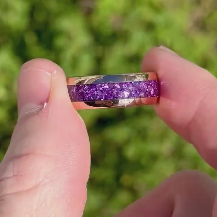 This men’s Amethyst Ring features an 8mm rose gold tungsten band with a stunning purple inlay. Durable and scratch-resistant, it combines modern style with lasting strength. Perfect as a wedding band, engagement ring, or unique promise ring. Personal engraving available for a meaningful touch.