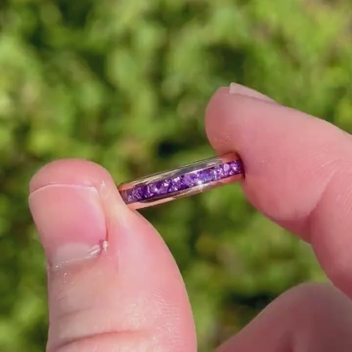 This rose gold wedding band features a crushed amethyst inlay, creating a stunning purple design. Handcrafted in 4mm tungsten, it is durable and made with a comfort fit for daily wear. A stylish option for women or men, perfect as a wedding band, promise ring, or anniversary gift.