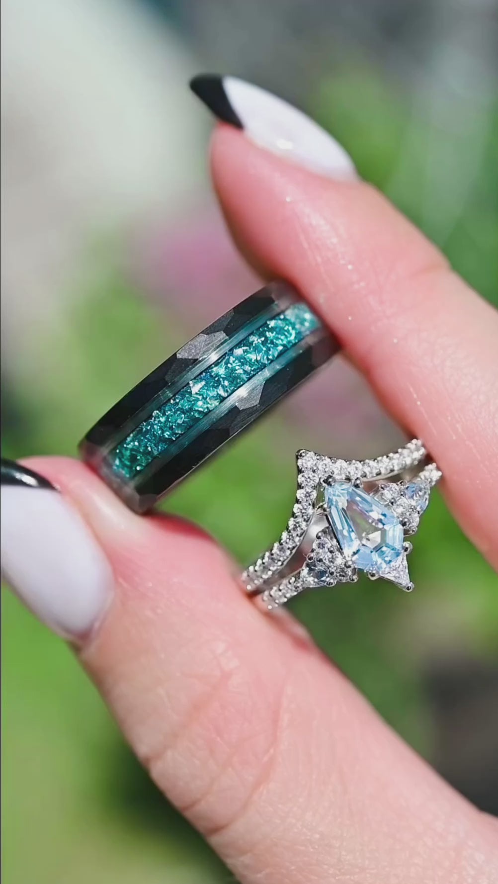 Introducing our Aquamarine Couple Ring Set, perfect for symbolizing your unique love story. This matching set features stunning blue aquamarine stones, ideal for engagements, weddings, or as a heartfelt promise ring. Make it truly yours with personalized engraving, adding a special touch to this beautiful gift.