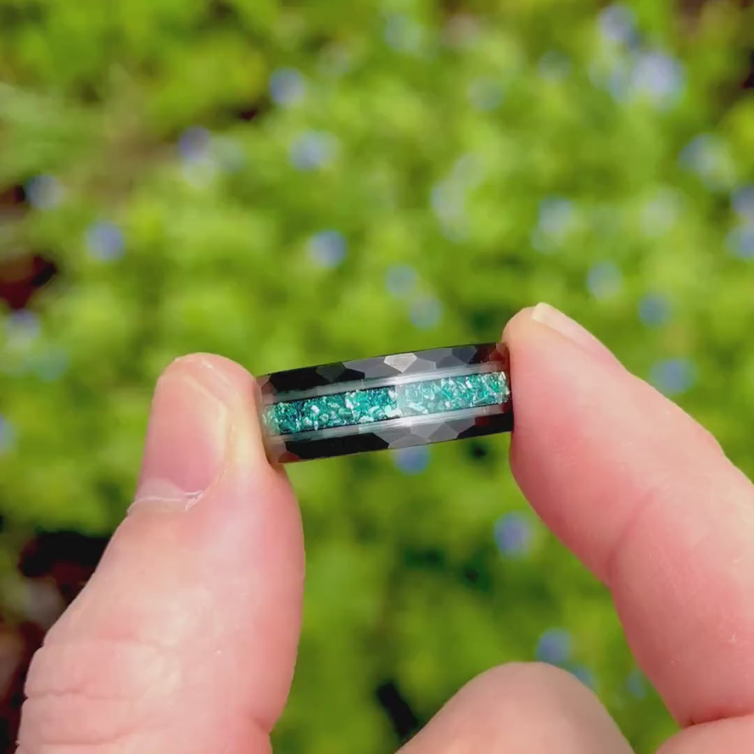 ►This black tungsten ring with a bold blue aquamarine inlay is available in both 8mm and 6mm widths. The hammered design adds rugged elegance, making it perfect for those seeking a unique wedding ring or promise ring while custom engraving options allow for a truly personal anniversary gift. Designed for style and durability, this ring embodies enduring strength and connection, making it an unforgettable choice for marking special moments.