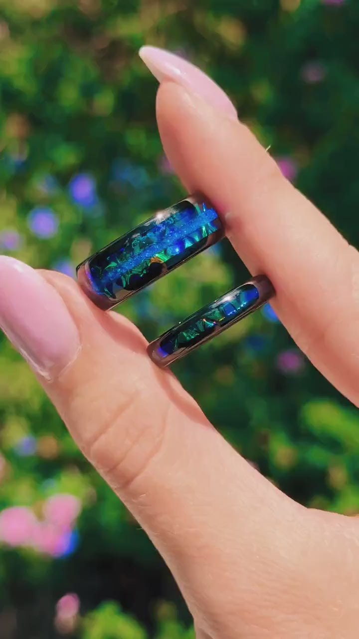 ►This striking Azure and Blue Fire Opal ring set features matching his and her tungsten bands, with mesmerizing dichrolam and dragon-inspired inlay. Available in 8mm and 4mm widths, this black tungsten set makes a unique choice for a wedding ring, promise ring, or memorable anniversary gift. Beautifully designed for both strength and style, it's perfect for couples who desire a distinctive, meaningful match in their rings. Personalize them with an engraving to create a lasting symbol of your love.