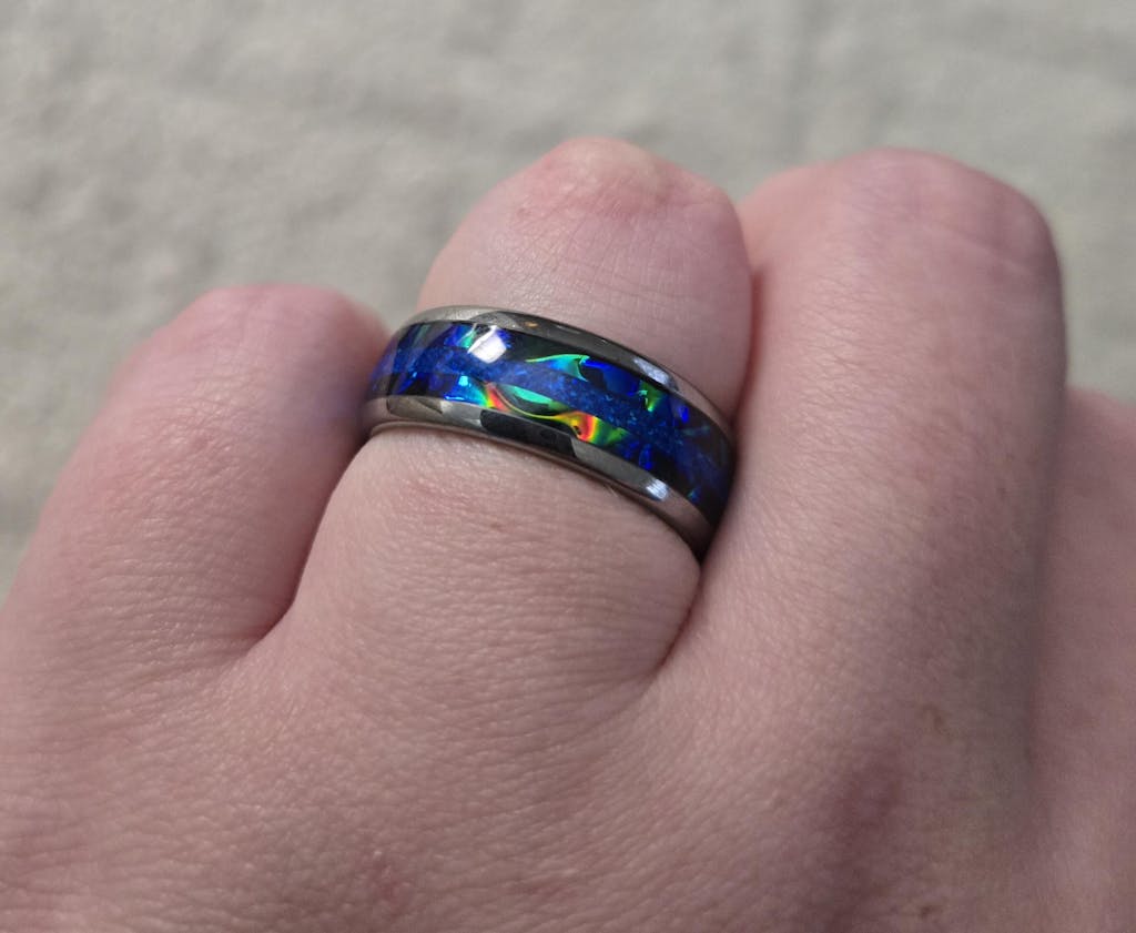 ►This ring contains authentic, made in the USA, Dichrolam burl created by John Blazy and his team. His flagship burl textures involve hand patterned dichroic films that are more vibrant and colorful than traditional opal materials.