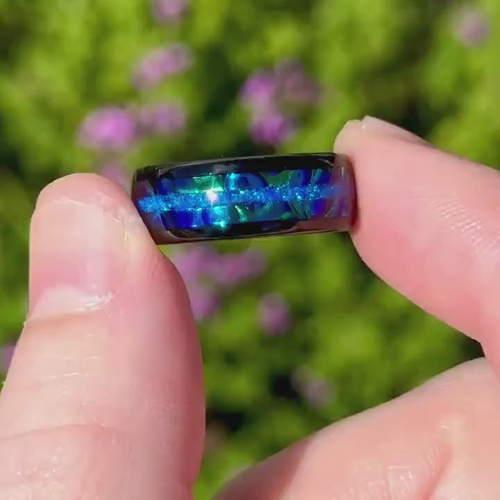 ►This Azure Blue Fire Opal tungsten band brings a cosmic touch with its nebula-inspired inlay, crafted from premium dichrolam for a stunning blue space effect. Perfect as a wedding ring, promise ring, or meaningful anniversary gift, this black ring is designed for durability and elegance. This ring captures both strength and style, offering a timeless design inspired by the beauty of the cosmos. Personalize it with custom engraving to add a unique touch, making it a truly special piece for him.