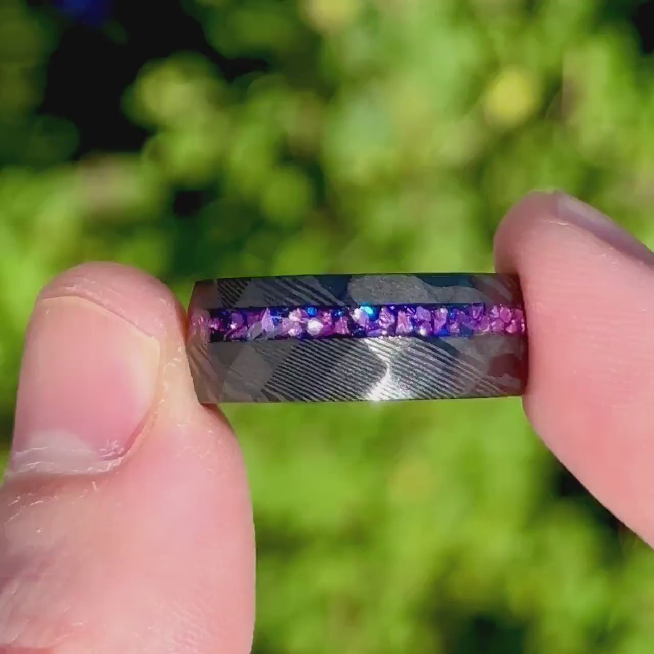 ►Crafted from resilient Damascus steel, this 8mm faceted band features a mesmerizing Crab Nebula-inspired Alexandrite inlay, blending cosmic elegance with rugged design. The purple space-inspired detail captures both strength and beauty, making it an exceptional choice for anyone seeking a ring that reflects depth and individuality. Perfect as a wedding ring, promise ring, or meaningful anniversary gift, this unique band can be personalized with engraving to add a special touch.