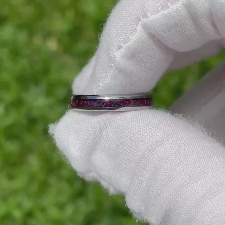 ►This 4mm silver tungsten band with crushed black fire opal inlay offers a unique touch with its polished dome design, perfect as a wedding ring, promise ring, or thoughtful anniversary gift. Durable and comfort-fit, it’s crafted to endure while symbolizing the depth of your commitment. Its timeless elegance can be personalized with engraving, making it a truly meaningful piece to celebrate your journey together.