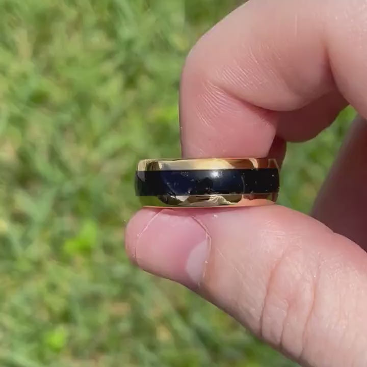 Black Onyx Mens Gold Tungsten Ring, 8mm Mens Wedding Band, Crushed Black Onyx Ring, Polished, Dome, Unique Wedding Band, Ring Engraving