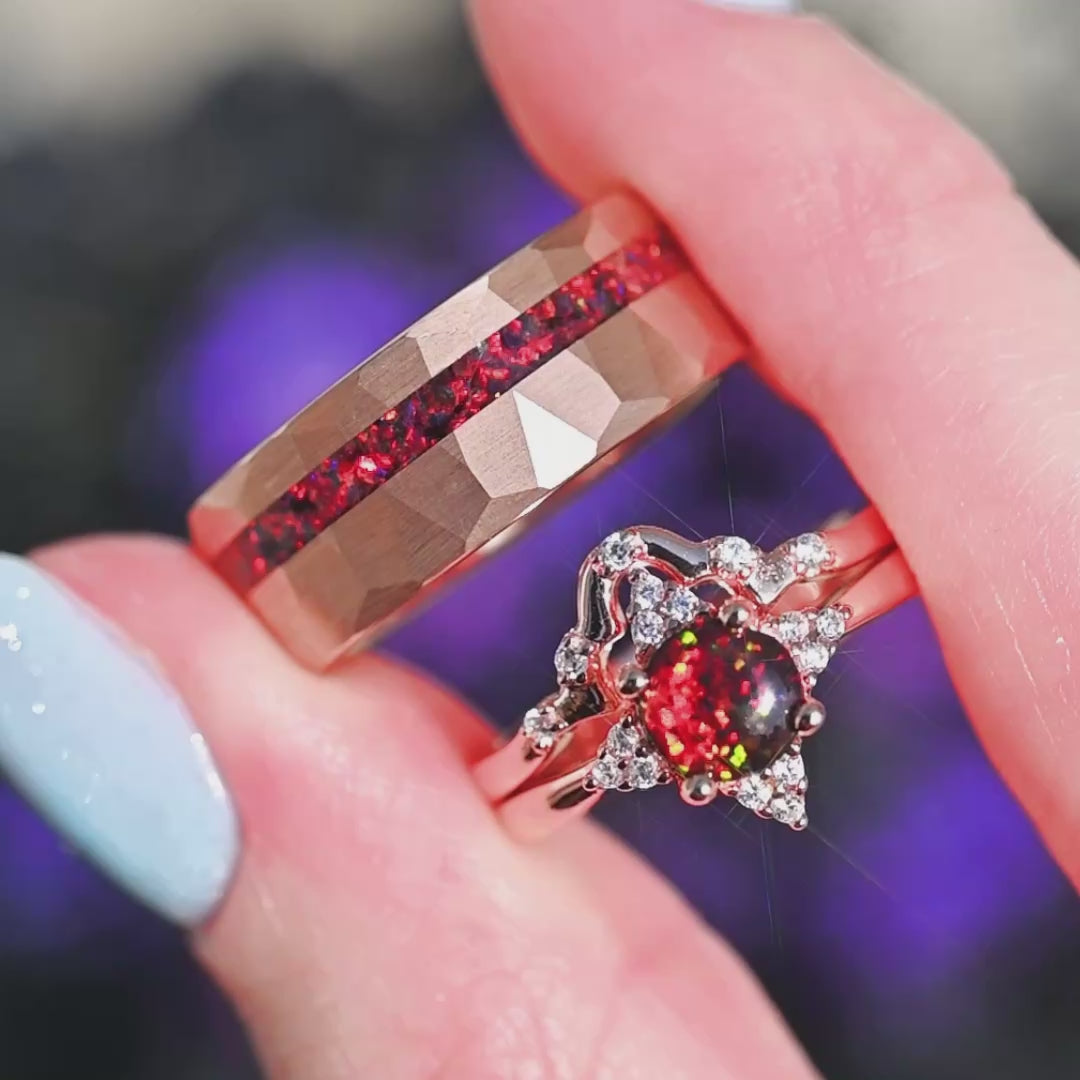 Veloura Black Opal Couples Ring in Rose Gold, His and Hers Wedding Ring Set, Black Fire Opal, Matching Bands, Nontraditional Engagement Ring Set