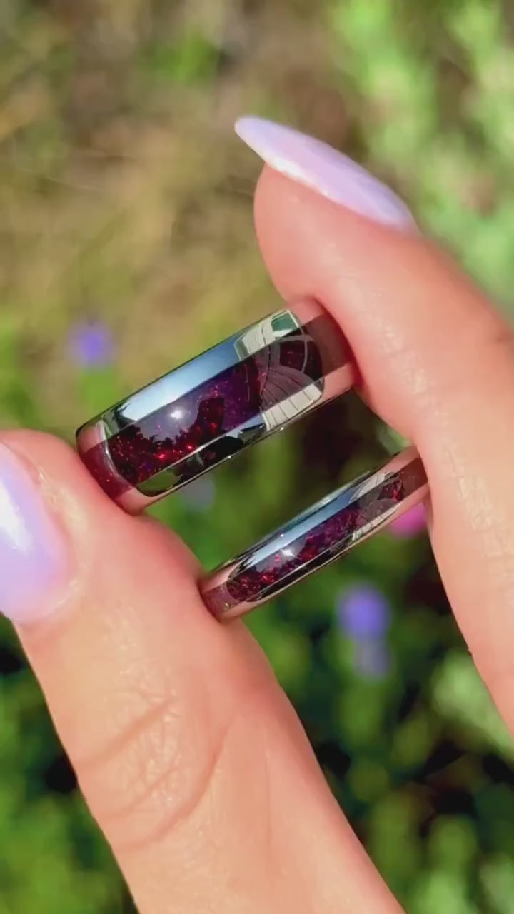 ►This dazzling Crushed Black Opal ring set, featuring a polished dome design, includes a silver tungsten band with a crushed fire opal inlay for him and her. Ideal as a wedding ring set or a meaningful promise ring, it also makes a unique anniversary gift. Optional engraving allows for a personal touch, making it a beautiful symbol of shared commitment.
