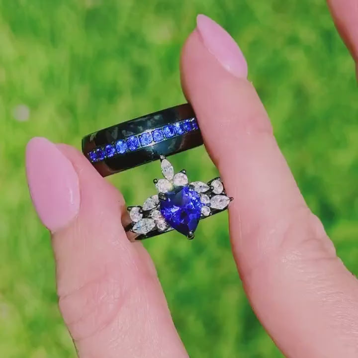 Black Sapphire Ring Set, His and Hers Wedding Band, Blue Sapphire Engagement Set, Couples Ring, Matching Promise Rings, Thin Blue Strip