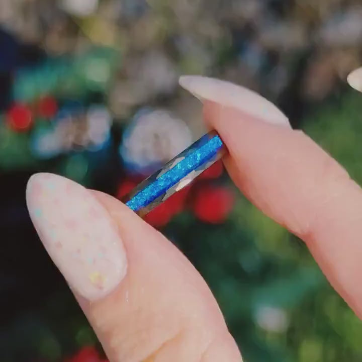 ►This 4mm Blue Fire Opal wedding band, crafted from hammered brushed black tungsten with a striking blue strip, is a stunning piece for any occasion. Whether chosen as a wedding ring, a unique promise ring, or a memorable anniversary gift, its bold design stands out. Make it even more special with personalized engraving, adding a timeless touch that captures your love's journey.