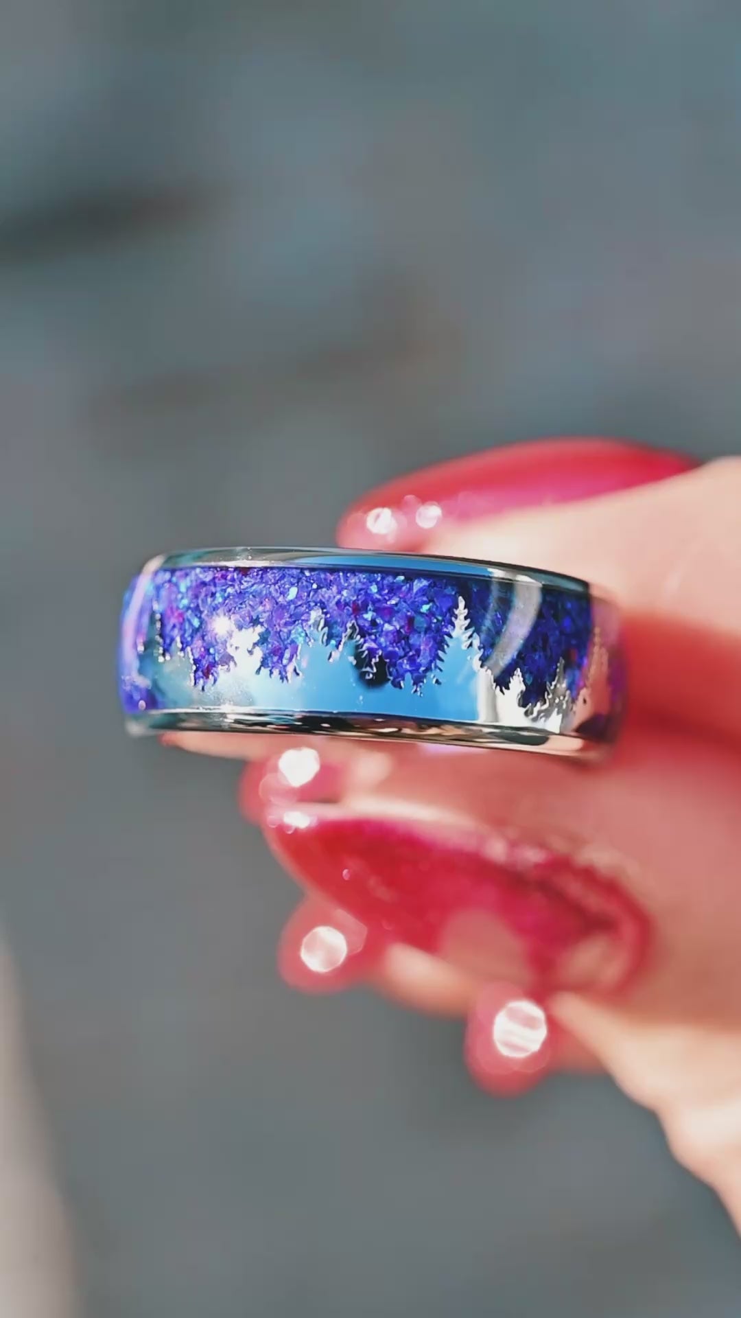 Inspired by the enchanting Aurora Borealis, this mens wedding band evokes the magic of the Northern Lights glowing through a quiet forest. Crafted from durable tungsten, it's made for everyday wear and perfect for those who want a ring that’s unique and nature inspired.