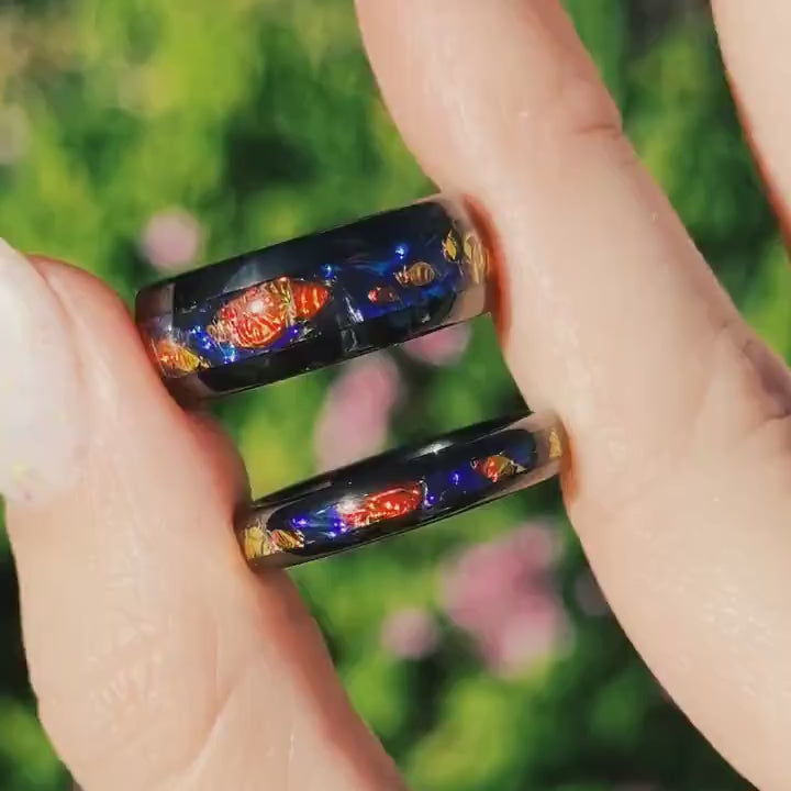 Caraxes Dragon Ring Set, His Her Tungsten Wedding Band, 8mm & 4mm Black Red Nubula Ring, Dichrolam, Unique Couple Ring, Match Promise Ring