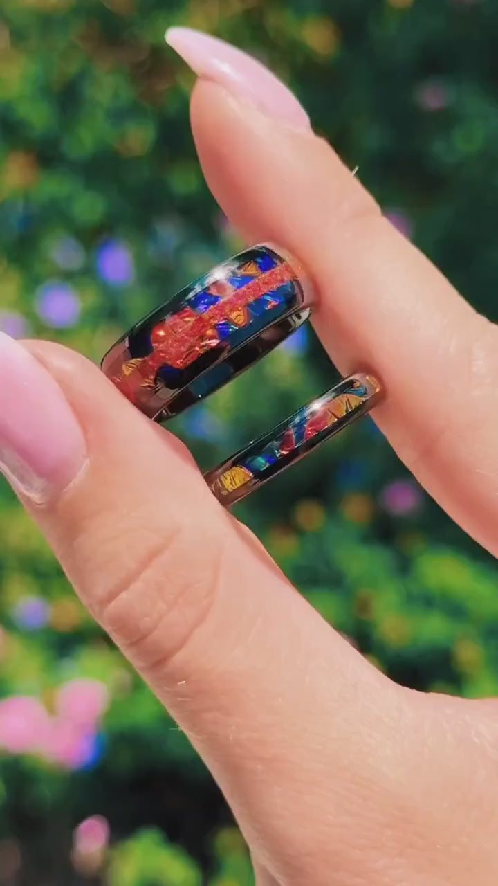 ►The Caraxes Red Fire Opal Couple ring set features black and red tungsten bands with vibrant Dichrolam inlays. Perfect as matching wedding rings or meaningful promise rings, these 8mm and 4mm bands symbolize strength and eternal love. Personalize them with custom engraving to create a unique and unforgettable anniversary gift.