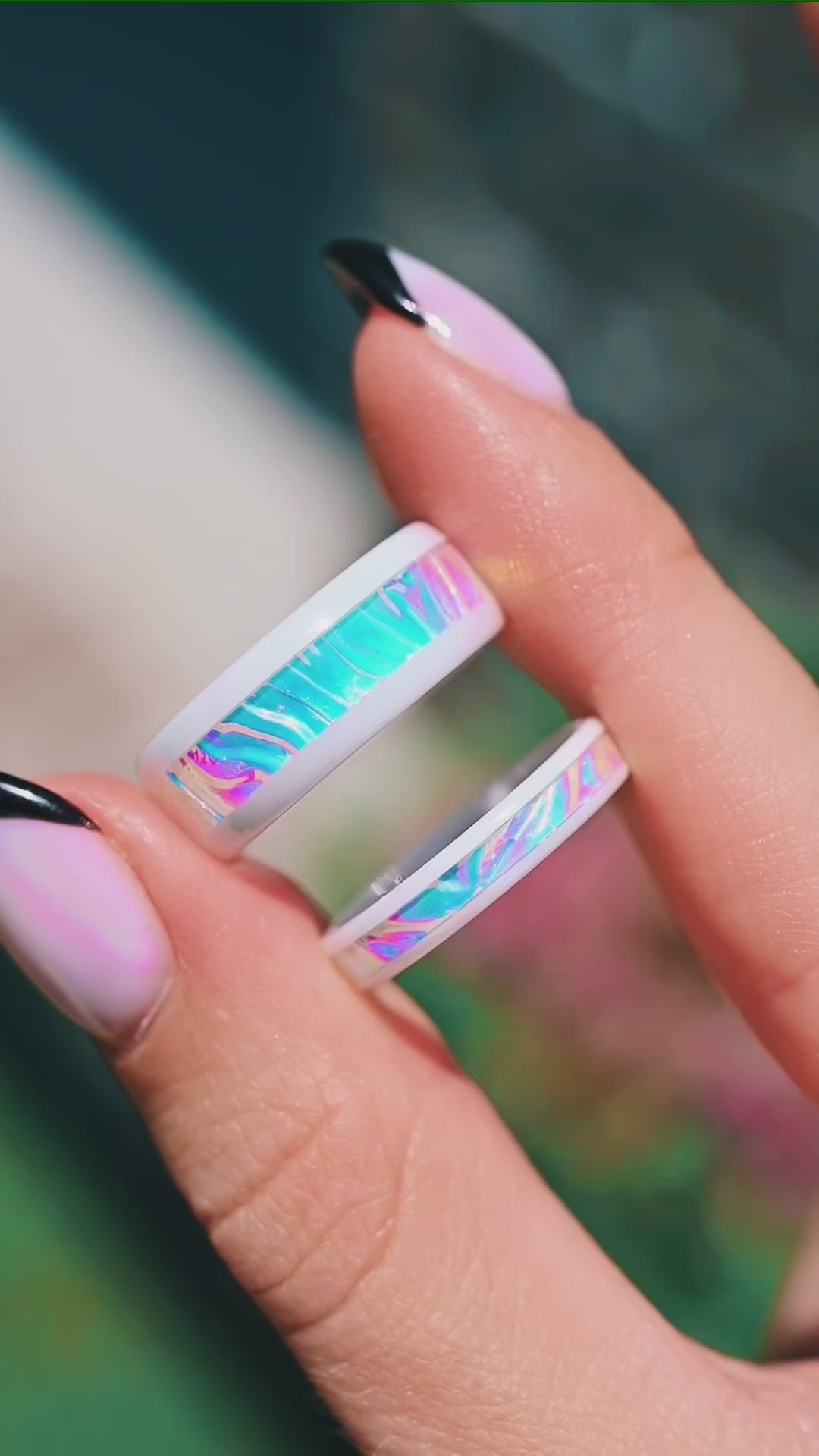 ►This ring contains authentic Dichrolam burl created by John Blazy and his team. His flagship burl textures involve hand patterned dichroic films that are more vibrant and colorful than traditional opal materials.