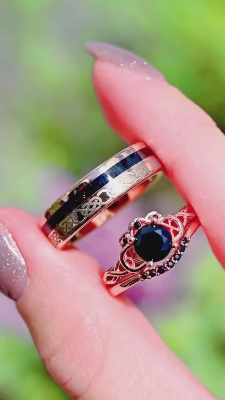 Couples Celtic Knot Engagement Ring Set, His and Her Black Onyx Wedding Ring Set, 925 Silver and Tungsten Promise Rings, Rose Gold Ring Set