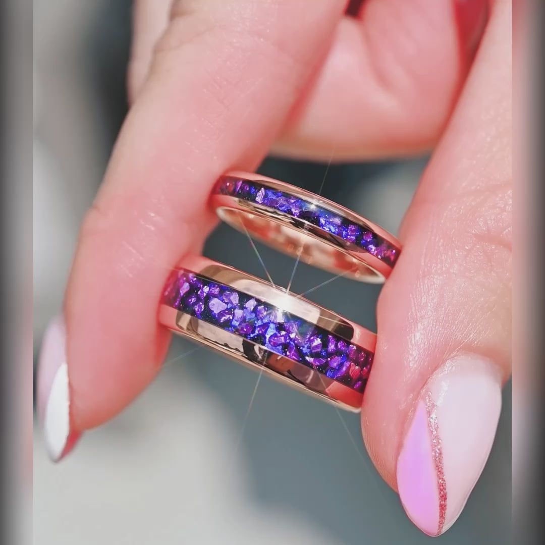 ►The Crab Nebula ring features a stunning alexandrite inlay set in a rose gold tungsten band, designed for both men and women. Perfect as a wedding ring, promise ring, or anniversary gift, this polished dome ring offers comfort and durability. Personalize with engraving for a special, lasting symbol of your commitment.