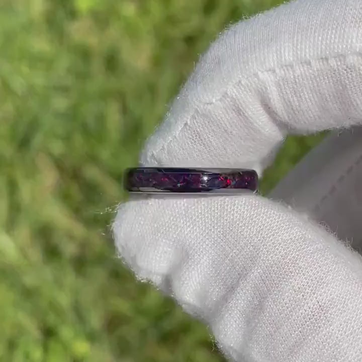 Crushed Black Fire Opal Ring, 4mm Black Ceramic Wedding Band, Women Men Ring, Black Opal Ring, Dome, Polish, Comfort Fit