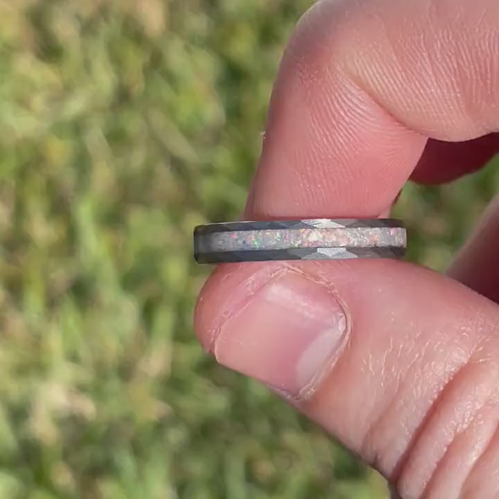 Crushed White Fire Opal Ring, 4mm Silver Tungsten Wedding Band, No Plating, Brushed, Flat, Hammered, Comfort Fit, Unique Men Women Ring