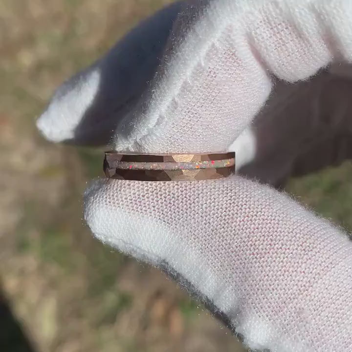 ►This stunning 4mm tungsten band features a crushed white fire opal inlay with a brushed matte, hammered finish. Available in rose gold or yellow gold plating, this ring is perfect as a wedding band, promise ring, or anniversary gift. Personalize it with engraving for a truly unique piece.