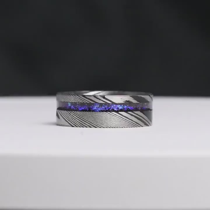 ►This unique Damascus ring features a stunning Orion Nebula design, crafted in stainless steel with a matte silver finish. A perfect wedding or anniversary gift, it can be personalized with engraving, making it a one-of-a-kind piece for him.