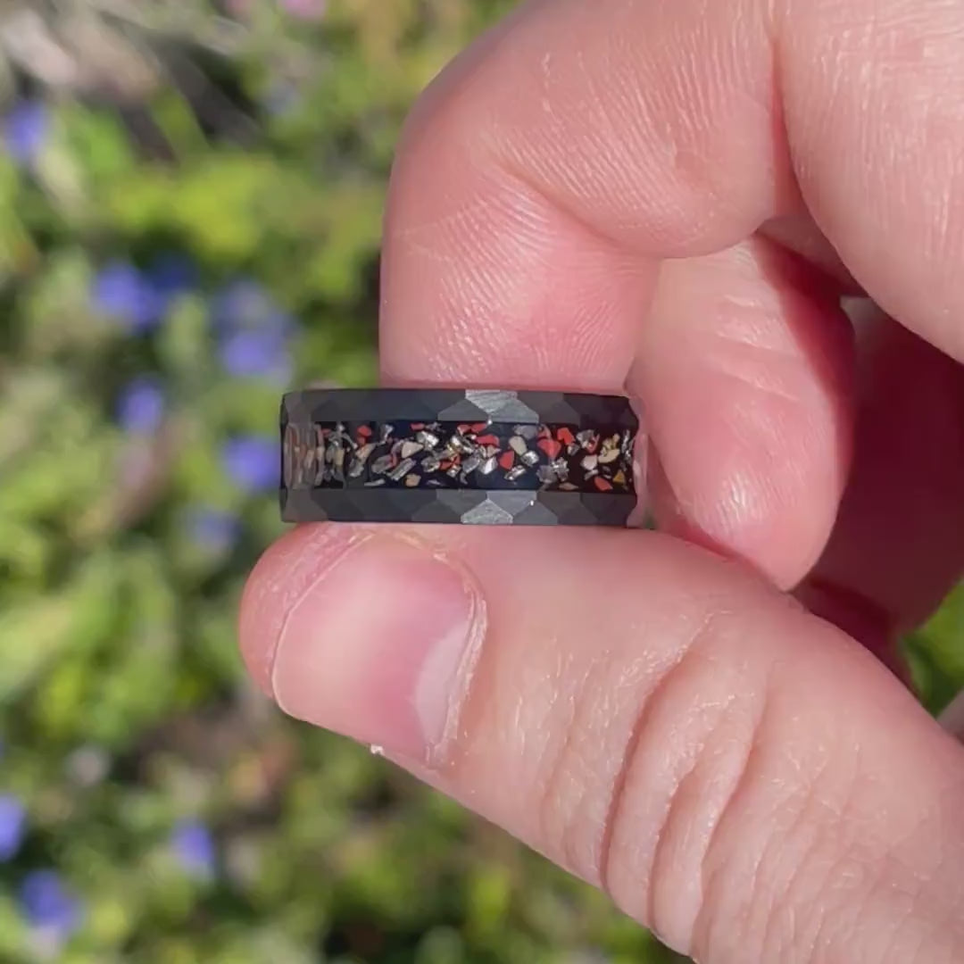 Dinosaur Bone Meteorite Hammered Ring, Matte Black Tungsten Ring, 8mm 6mm Mens Wedding Band, Real Dinosaur Bone Meteorite Ring, Unique Ring