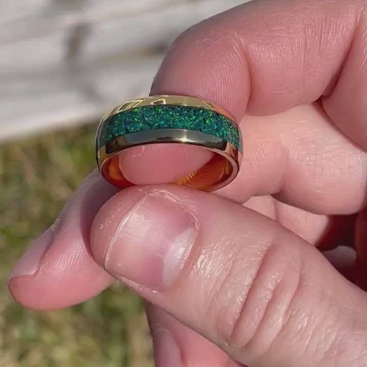 Emerald Coast Ring, 8mm Tungsten Wedding Band, Opal Ring, Gold Plated Ring, Black Emerald Opal, Polish, Dome, Comfort Fit, Gift for Him