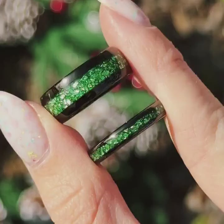 ►This elegant Emerald His and Hers ring set features black tungsten wedding bands with vibrant emerald glass stones, perfect for celebrating love as a wedding ring, promise ring, or a thoughtful anniversary gift. The 8mm and 4mm matching bands offer a striking yet timeless look, making them ideal for couples who value style and durability. Add a personal touch with custom ring engraving to symbolize your unique bond.