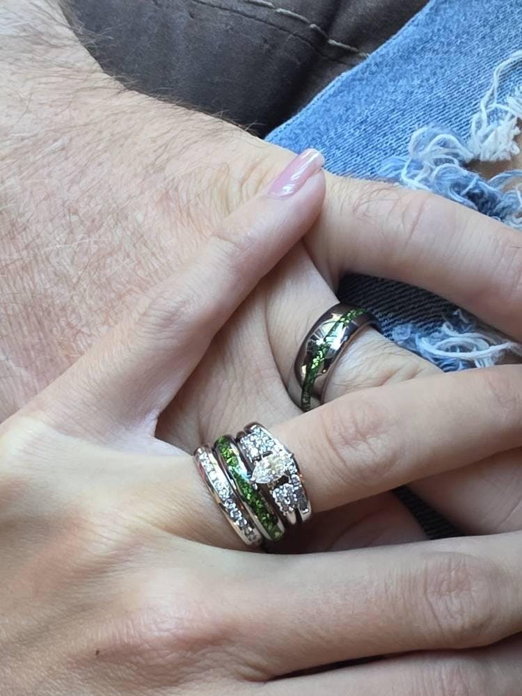 ►This elegant His and Hers Emerald ring set features silver tungsten bands with vibrant emerald glass stones, perfect for a wedding ring, promise ring, or a meaningful anniversary gift. The matching bands, available in 8mm and 4mm widths, offer timeless elegance and can be personalized with engraving for a special touch.