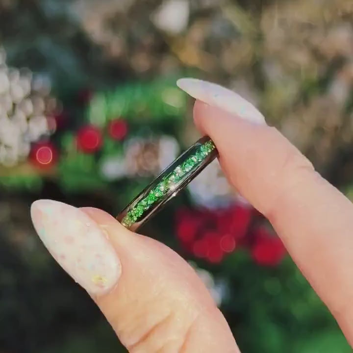 Elevate your commitment with our exclusive handmade tungsten wedding band, designed with a captivating emerald inlay that sparkles with depth and allure. A sophisticated blend of durability and luxury, this ring is not only a symbol of love but also a statement of style.