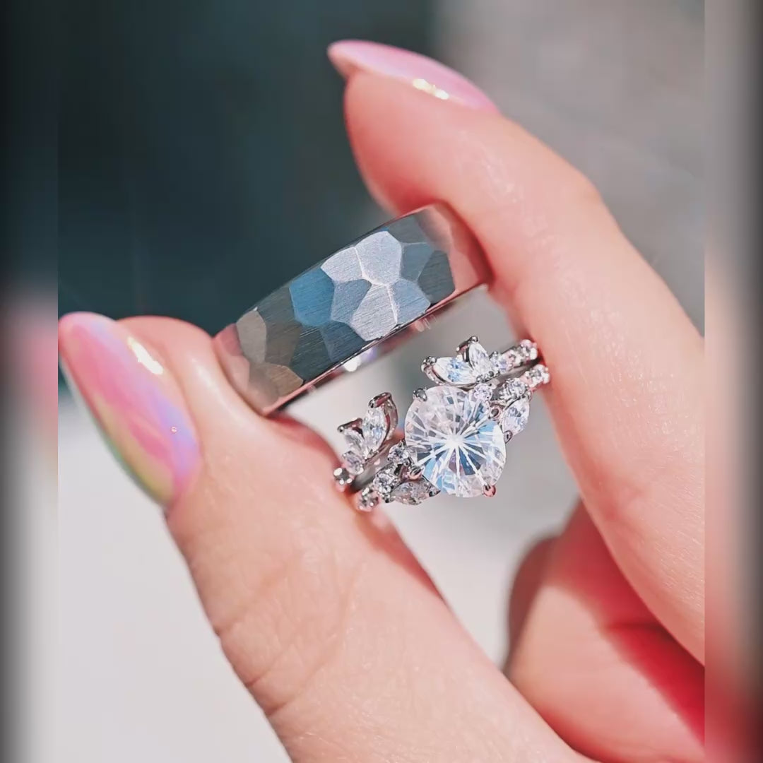 The Everleaf Couples Ring Set includes a rugged tungsten carbide band for him, featuring a brushed and hammered finish, and a sterling silver engagement ring for her with a natural white sapphire centerpiece and delicate leafy stacking band - a perfect symbol of enduring love.