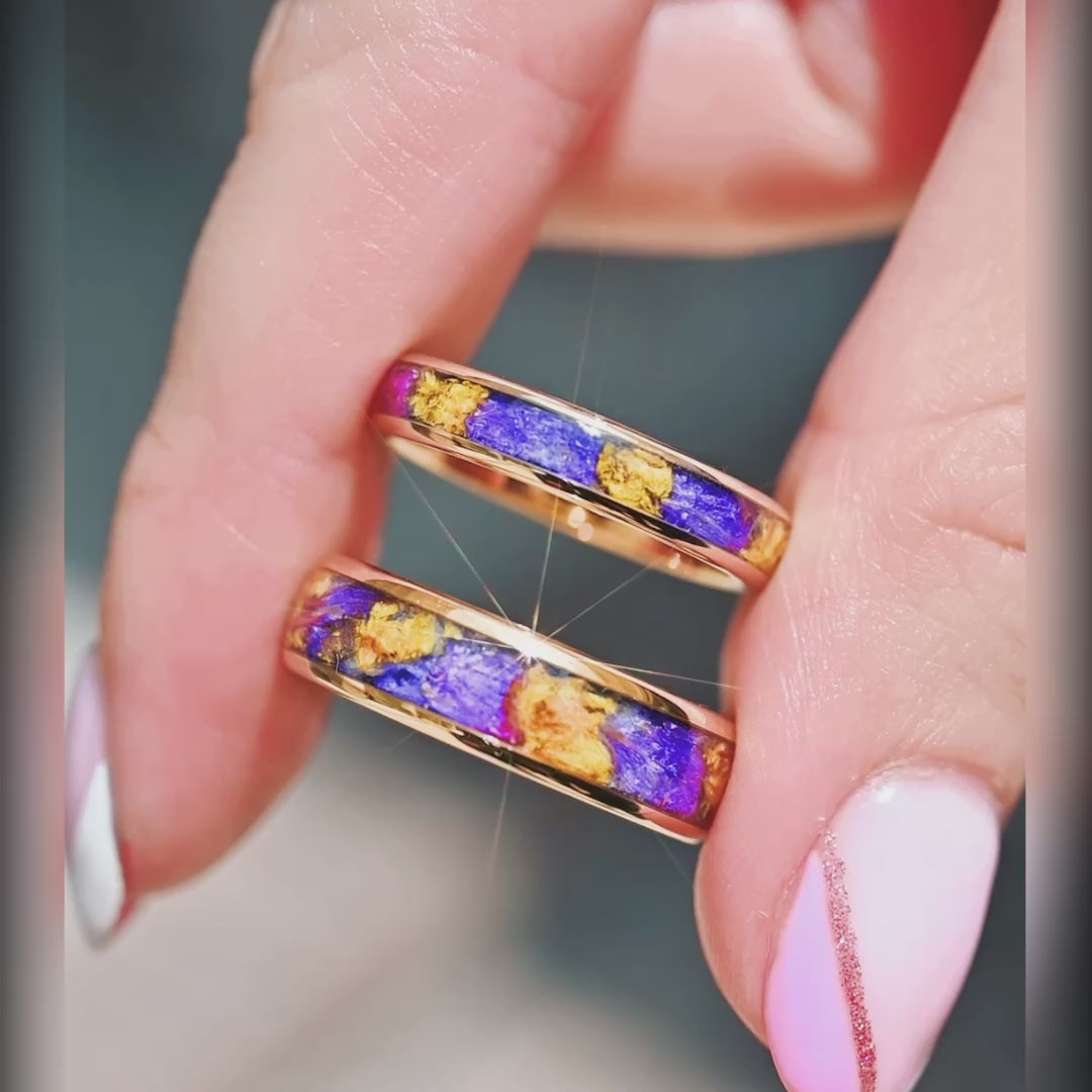 Celebrate your love with this gold tungsten couples ring set featuring real forget-me-not flowers. Includes 4mm and 6mm comfort fit bands. These nature-inspired rings are perfect as wedding bands or meaningful matching rings for couples who value timeless beauty and lasting love.