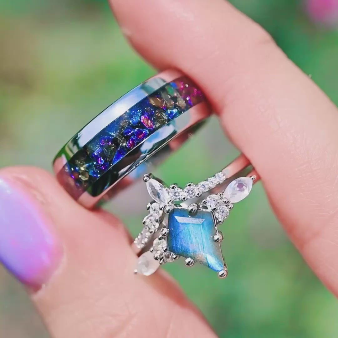 ►This Galaxy Labradorite Engagement Ring Set in 925 sterling silver features a stunning kite-cut stone and Veil Nebula-inspired design. Perfect as an alternative wedding ring or moonstone promise ring, it makes an unforgettable anniversary gift. Customize it with engraving to create a truly personal symbol of your everlasting love.