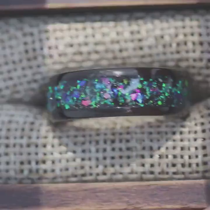 Galaxy Opal Ring, Mens Wedding Band, Engraving, 8mm Black Tungsten Ring, Domed, Polished, Black Opal Band, Galaxy Ring, Black Nebula Ring