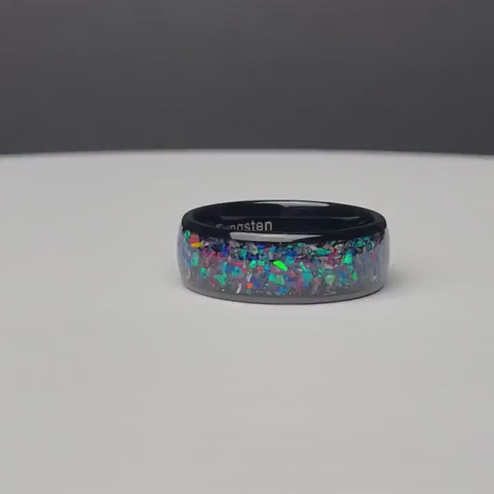►The Glow Meteorite and Galaxy Opal Ring Set features stunning his and hers black tungsten wedding bands with polished dome designs. Perfect as wedding rings or meaningful promise rings, these comfort fit bands radiate cosmic beauty, making them an unforgettable anniversary gift for couples. Personalize your set with custom engraving to celebrate your love in a unique and lasting way.