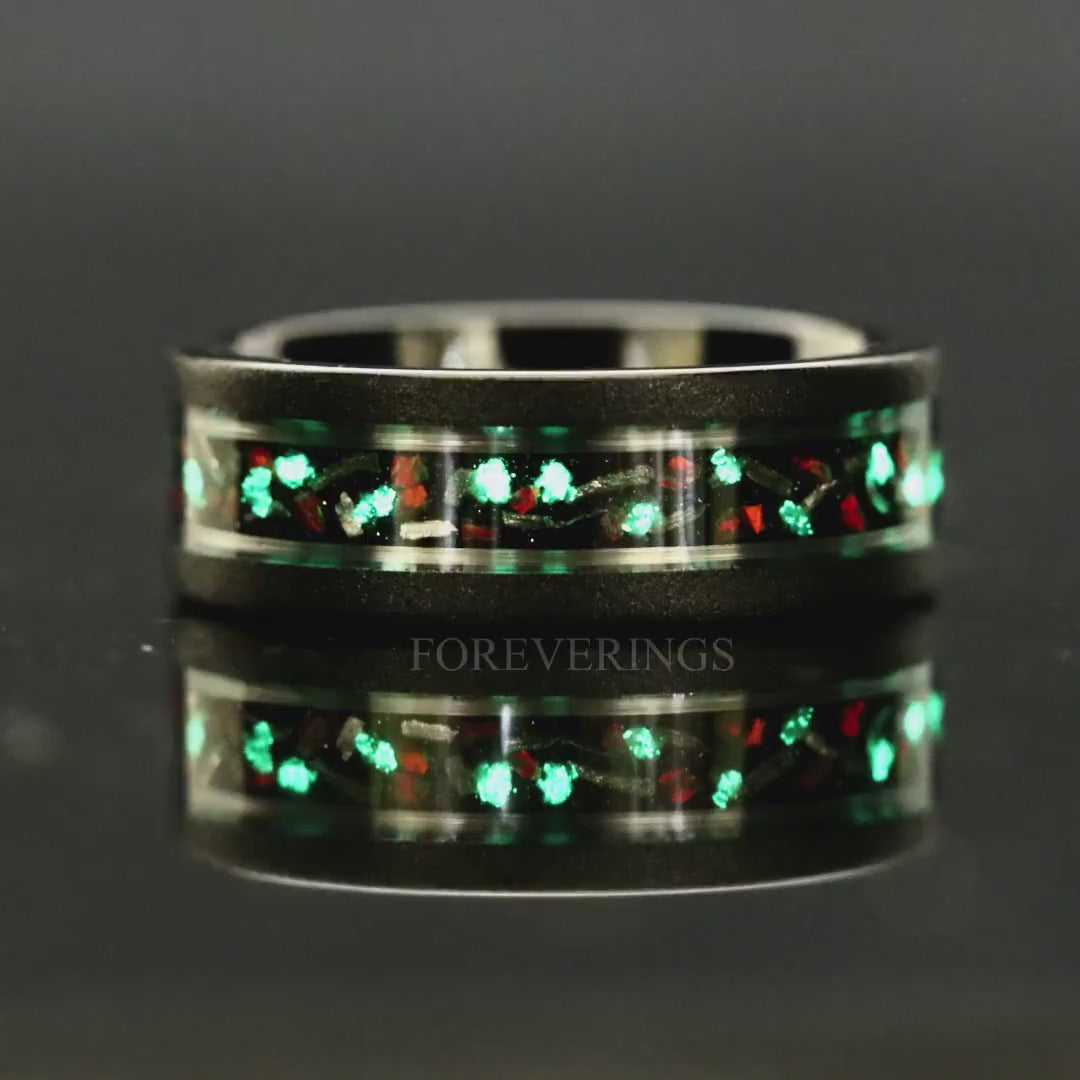 Glow Meteorite Galaxy Red Opal Ring, Man Glow in the Dark Wedding Band, 8mm Black Tungsten Ring, Sandblasted Two Tone Black and Silver Strip