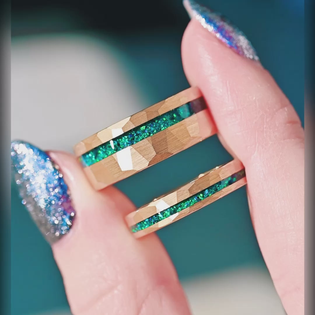 This handmade emerald opal band features a hammered gold tungsten finish. Durable and stylish, it's perfect as a wedding or promise ring for men and women. Add custom engraving for a meaningful gift.