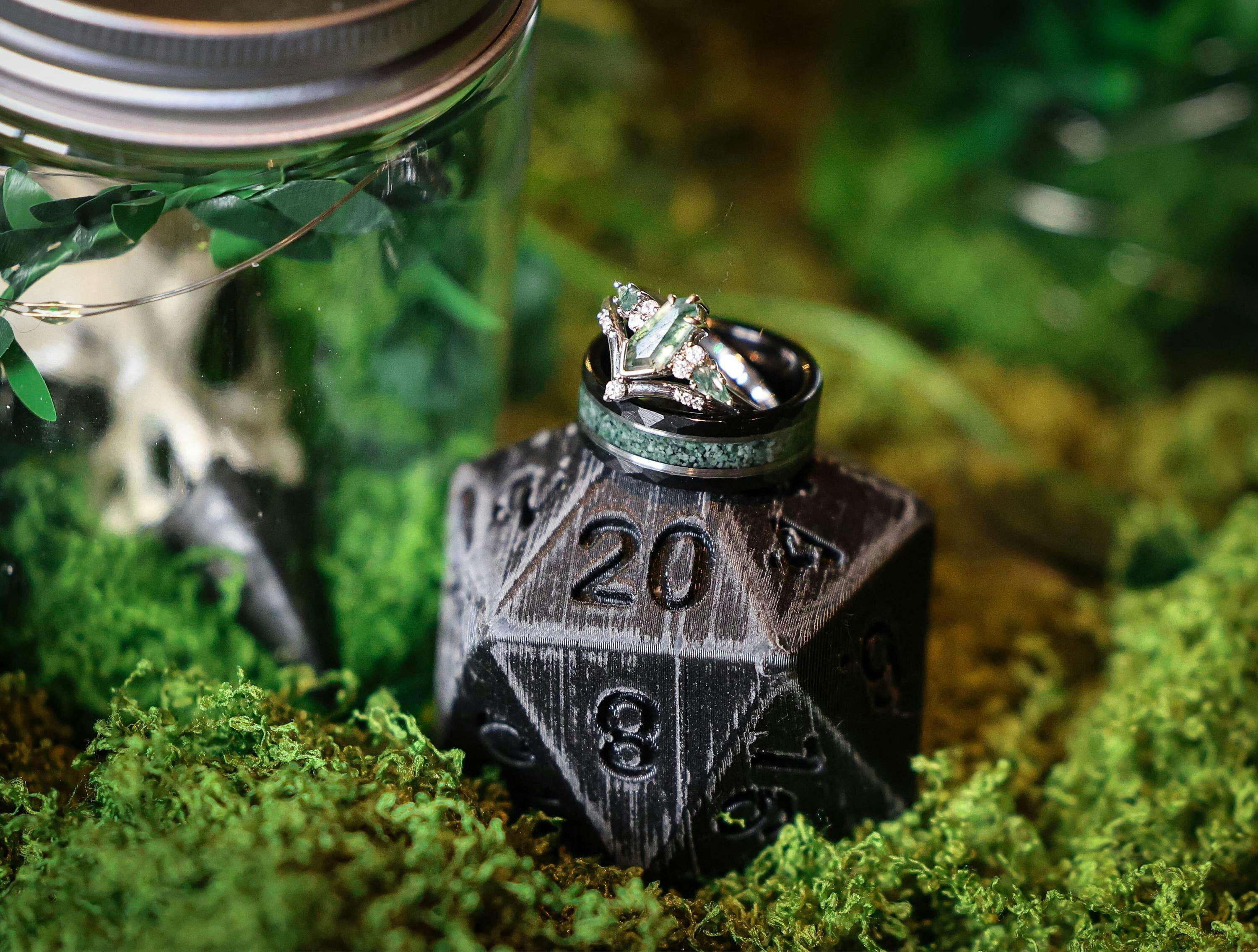 ►His ring is Tungsten Carbide with Crushed Green Moss Agate Inlay