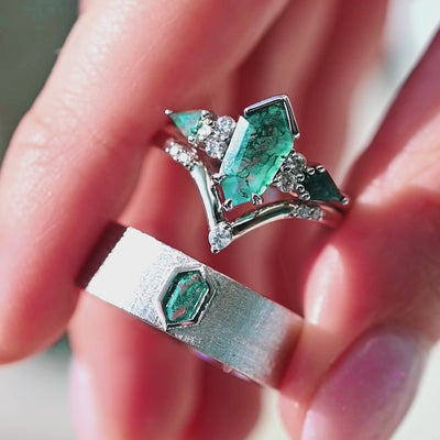 Green moss agate couples ring set in 925 sterling silver, featuring matching hexagon-cut moss agate center stones. Nature-inspired and truly unique - an alternative engagement ring set for him & her that also works as promise rings or a wedding ring set.
