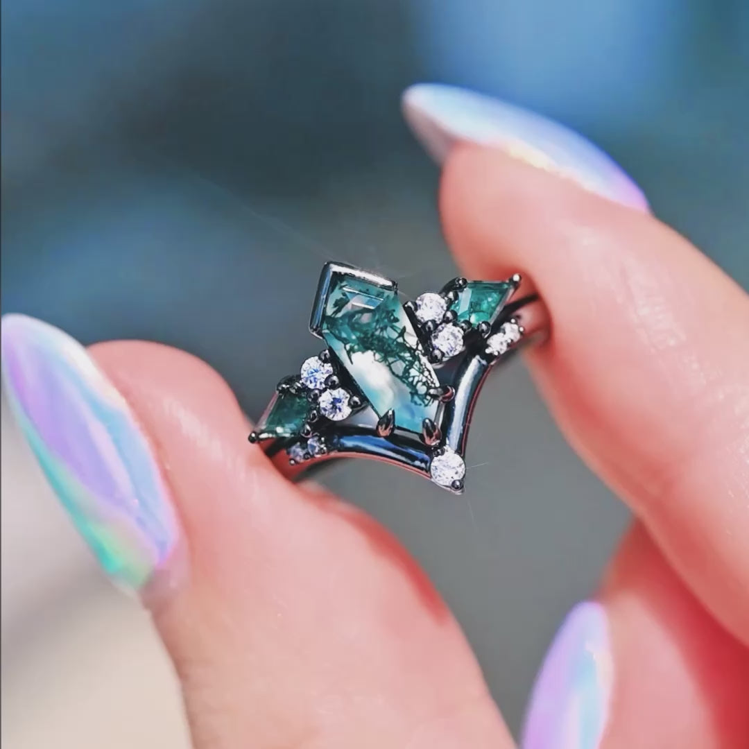 Green Moss Agate Engagement Ring Set Coffin Kite Cut, Black Gold Filled Ring, 925 Sterling Silver, Nature Ring, Black Rhodium Finish